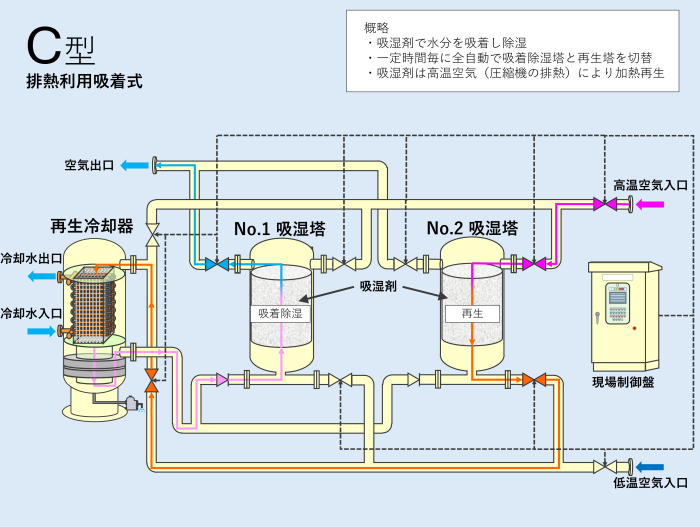 ハイグロマスター「C型」は、乾燥剤(吸湿剤)で圧縮空気中の水分を吸湿し、冷却式では得られない超低露点の空気を得る除湿機です。